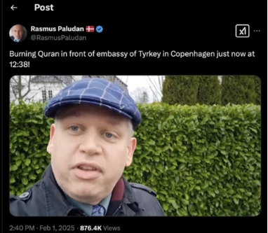Stram Kurs Partisi'nin kurucusu Paludan, Danimarka'nın başkenti Kopenhag'daki Türkiye Büyükelçilik binası önünde video çekerek, "Türkiye Büyükelçiliği'nin önündeyim" ifadelerini kullandı ve Kuran'ı Kerim yaktı.