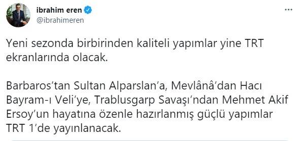 TRT Genel Müdürü İbrahim Eren, yaptığı açıklamada “Yeni sezonda birbirinden kaliteli yapımlar yine TRT ekranlarında olacak. Barbaros’tan Sultan Alparslan’a, Mevlânâ’dan Hacı Bayram-ı Veli’ye, Trablusgarp Savaşı’ndan Mehmet Akif Ersoy’un hayatına özenle hazırlanmış güçlü yapımlar TRT 1’de yayınlanacak” ifadelerini kullandı.