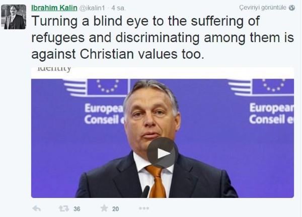 İbrahin Kalın, Macaristan'ın sağcı Başbakanı Victor Orban'ın Müslüman mültecileri hedef alan açıklamasına insanlık dersi niteliğinde bir cevap verdi.
