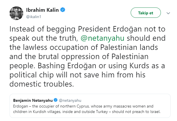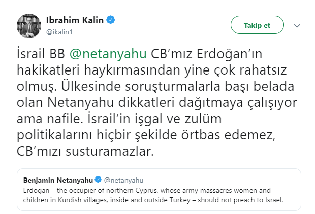 İbrahim Kalın açıklamasında, "İsrail Başbakanı Netanyahu, Cumhurbaşkanı’mız Erdoğan’ın hakikatleri haykırmasından yine çok rahatsız olmuş. Ülkesinde soruşturmalarla başı belada olan Netanyahu dikkatleri dağıtmaya çalışıyor ama nafile. İsrail’in işgal ve zulüm politikalarını hiçbir şekilde örtbas edemez, Cumhurbaşkanımızı susturamazlar." dedi.