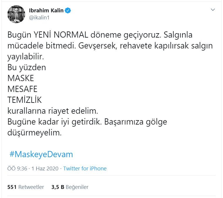 Cumhurbaşkanlığı Sözcüsü Kalın, Twitter'daki hesabından bugün itibariyle başlayan yeni normale ilişkin paylaşım yaptı.