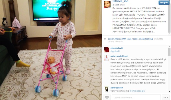 "Bu dönem, artık kimse beni vekillikten vazgeçiremeyecek. Hayır, diyorum çünkü bu kez kızım Elif Ada için istiyorum. Hemşerilerimin yanımda olduğunu biliyorum. Amerika dönüşü inşallah çalışmalarıma başlayacağım. Sevenlerimle paylaşmak istedim. Bu saatten sonra hizmette sınır yok. Saygılar yeni vekil adayınız Şanlıurfalı İbrahim Tatlıses."