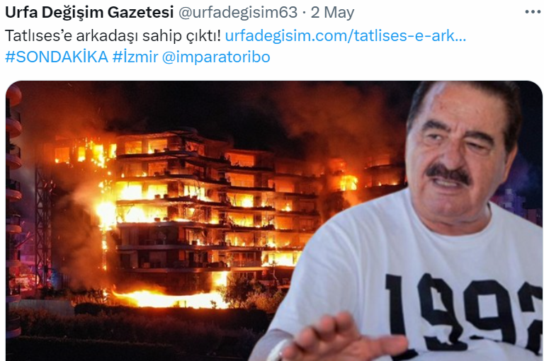 Gazeteci Birsen Altuntaş'ın sitesinde yer alan habere göre, İbrahim Tatlıses’in İzmir Narlıdere’deki evi geçen günlerde yanmıştı, şans eseri o sırada İstanbul’da olan Tatlıses bir arkadaşında kaldığını belirtti ve “Allah dostların eksikliğini vermesin. Süleyman diye bir dostumuz var sağolsun, İzmir’de 10 dönüm üzerine kurulu malikanesini bize tahsis etti. Var olasın “Sultan Süleyman kardeşim” he de Rehatiye bak” tweet’iyle arkadaşına teşekkür etti. Bu konuyu “Tatlıses’e arkadaşı sahip çıktı” başlığıyla haber yapan ve Tatlıses’e gönderen Urfa Değişim Gazetesi ünlü sanatçıyı küplere bindirdi.