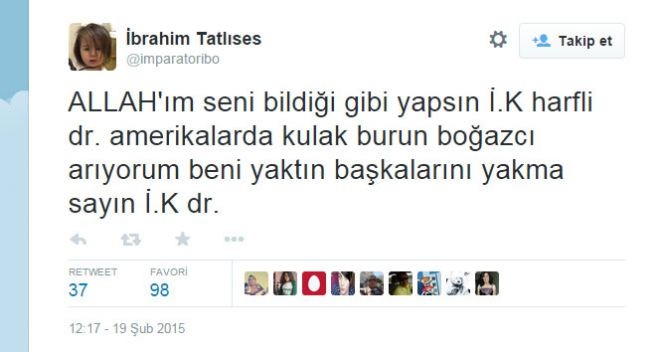 Ünlü şarkıcı İbrahim Tatlıses paylaştığı yazıda; "Allah'ım seni bildiği gibi yapsın İ.K harfli doktor Amerikalarda kulak burun boğazcı arıyorum beni yaktın başkalarını yakma sayın İ.K dr" diyerek doktoruna ateş püskürdü.