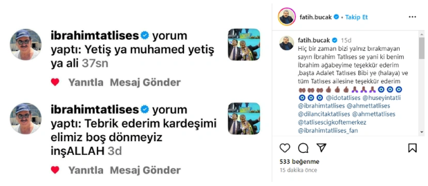 Şanlıurfalı ünlü sanatçı İbrahim Tatlıses, sosyal medya hesabından Bucak Aşireti mensubu Fatih Mehmet Bucak'ın yaptığı paylaşıma yorum yaptı. 2019 yılında CHP'den Siverek Belediye Başkan adayı olan Fatih Mehmet Bucak, 2024 yerel seçimlerinde AK Parti'den Siverek Belediye Başkanı seçilen Ali Murat Bucak'a destek verdiğini görüntüleri paylaşmıştı. Ünlü şarkıcı Tatlıses Fatih Bucak'ın yaptığı paylaşımlara, 'Yetiş ya Muhammed yetiş ya Ali', 'Tebrik ederim kardeşimi elimiz boş dönmeyiz inşallah' yorumlarında bulunarak destek verdiğini açıkladı.