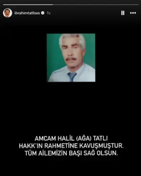 Tatlıses, acı haberi Instagram hesabı üzerinden yaptığı paylaşımla duyurdu. İbrahim Tatlıses mesajında, "Amcam Halil (Ağa) Tatlı, Hakk'ın rahmetine kavuşmuştur. Tüm ailemizin başı sağ olsun" ifadelerini kullandı.