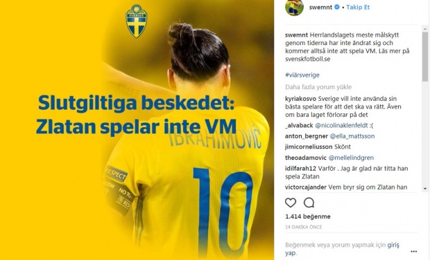 2018 Dünya Kupası'nda Zlatan Ibrahimovic'in olup olmayacağı sonunda açıklığa kavuştu. İsveç Milli Takımı'nın Instagram hesabından yapılan açıklamada Zlatan Ibrahimovic'in Dünya Kupası'nda yer almayacağı açıklandı.