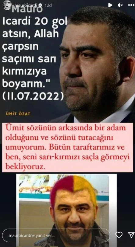 Galatasaray'ın Arjantinli yıldızı Mauro Icardi, daha önce "Icardi, 20 gol atarsa saçımı sarı-kırmızıya boyarım" diyen Fenerbahçe'nin eski kaptanı Ümit Özat'a mesaj yolladı.