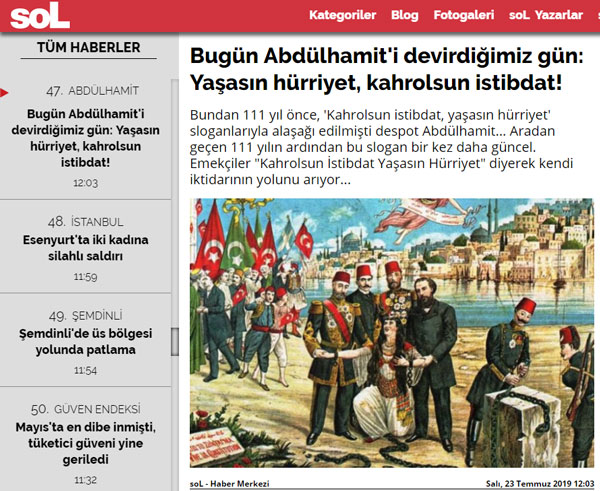 SoL Haber isimli irin birinkitisi, bugün attığı manşette, “Bugün Abdülhamit'i devirdiğimiz gün: Yaşasın hürriyet, kahrolsun istibdat!” ifadesini kullandı.