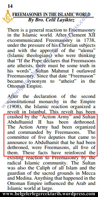 Türkiye Hür ve Kabul Edilmiş Masonlar Locası Üstadı ve locanın resmi yayın organı Tesviye Dergisi’nin editörü Celil Layiktez, dünya masonlarına, “İslam Ülkelerinde Masonluk” başlıklı İngilizce makalesinde, Osmanlı Devleti’nde masonluğun nasıl kökleştiğini anlatmış ve Abdülhamit devrine ait bilgiler vermişti. Mason Layiktez, 1908′de 2’nci Meşrutiyet’in ilanından sonra ‘İslamcıların’ İstanbul’da ayaklanma çıkardığını ve bu ayaklanmanın Hareket Ordusu tarafından bastırılarak Sultan Abdülhamit’in tahttan indirildiğini vurgulamıştı. “Hareket Ordusu, masonlar tarafından örgütlendi ve yönetildi” diyen Layiktez, “Sultan Abdulhamit’e tahttan indirildiğini tebliğ eden 5 milletvekilinden oluşan heyettekilerin tamamı masondu” ifadesini kullanmıştı.