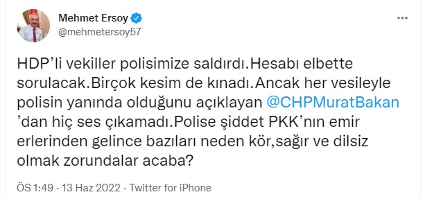 Mehmet Ersoy, “HDP’li vekiller polisimize saldırdı. Hesabı elbette sorulacak. Birçok kesim de kınadı. Ancak her vesileyle polisin yanında olduğunu açıklayan @CHPMuratBakan’dan hiç ses çıkamadı. Polise şiddet PKK’nın emir erlerinden gelince bazıları neden kör, sağır ve dilsiz olmak zorundalar acaba?” ifadeleriyle sorduğu soruya büyük beğeni gelirken, CHP cenahından ise herhangi bir etkileşimde bulunulmaması dikkat çekti.