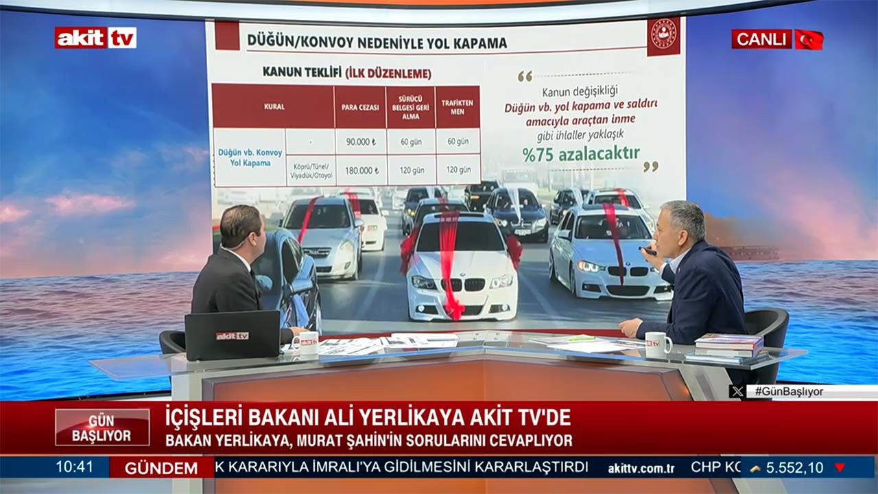 İçişleri Bakanı Ali Yerlikaya, Akit TV’de trafikte yeni dönemin detaylarını anlattı. Denetimlerin artırıldığını, caydırıcılığın merkeze alındığını vurgulayan Bakan Yerlikaya, yasa dışı çakar, makas atma, kırmızı ışık ihlali, yüksek ses, alkol, uyuşturucu ve motokurye ihlallerine yönelik “hibrit ceza sistemi”ni anlattı. Yeni düzenlemelerle ehliyete el koymadan araç men etmeye, ağır para cezalarından süreli iptallere kadar geniş kapsamlı yaptırımlar getirileceğini belirten Bakan Yerlikaya, “Yolların kralları olmaz, kuralları olur. Caydırıcılık sayesinde 8-9 ay içinde Türkiye’de makas ve yasa dışı çakar gibi ihlaller bıçak gibi kesilecek. Trafik en büyük kul hakkıdır; kurallara riayet eden kazanır.” dedi.