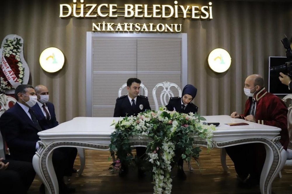 Resmi üniformalarıyla törene katılan genç çiftin nikah şahitliğini, Düzce Valisi Cevdet Atay ile İl Emniyet Müdürü Mehmet Ali Akkaplan yaptı.