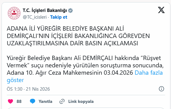 Yüreğir Belediye Başkanı Ali DEMİRÇALI hakkında “Rüşvet Vermek” suçu nedeniyle yürütülen soruşturma sonucunda, Adana 10. Ağır Ceza Mahkemesinin 03.04.2026 tarih ve E:2024/17 sorgu sayılı kararı ile 5 yıl 3 ay 10 gün hapis cezası verilmesi üzerine, Anayasanın 127’nci maddesi ile 5393 sayılı Belediye Kanununun 47’nci maddesi uyarınca geçici bir tedbir olarak İçişleri Bakanlığı’nca görevden uzaklaştırılmıştır.