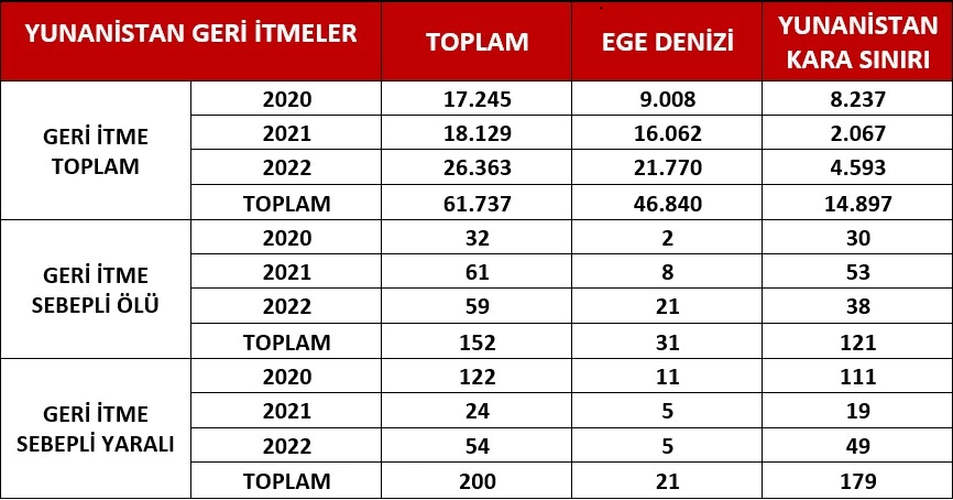 İnsanlık dışı muamelelerinden geri adım atmayan Yunanistan’ın geri itme uygulamaları neticesinde; 2020 yılından bu yana 46.840’ı Ege Denizinde, 14.897’si Yunanistan kara sınırında olmak üzere toplam 61.737 göçmen geri itmeye maruz kalmıştır. Bu geri itmeler sonucunda 152 göçmen hayatını kaybetmiş, 200 göçmen de yaralanmıştır.