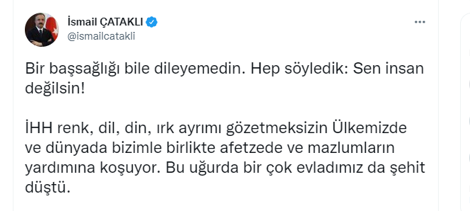 "Bir başsağlığı bile dileyemedin. Hep söyledik: Sen insan değilsin!" diyen Çataklı, şöyle devam etti: