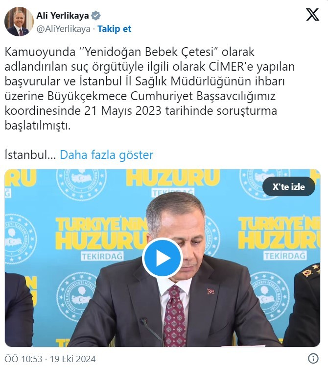 İçişleri Bakanı Ali Yerlikaya, X hesabı üzerinden ‘’Yenidoğan Bebek Çetesi’’ ile alakalı bir açıklama yaptı...