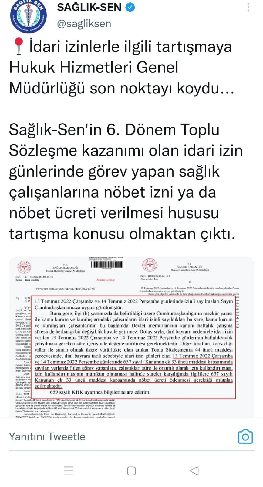 Sağlık -Sen Sendikası resmi sosyal medya hesabından yapılan açıklamada şu ifadeler yer aldı; "Sağlık-Sen'in 6. Dönem Toplu Sözleşme kazanımı olan idari izin günlerinde görev yapan sağlık çalışanlarına nöbet izni ya da nöbet ücreti verilmesi hususu tartışma konusu olmaktan çıktı"