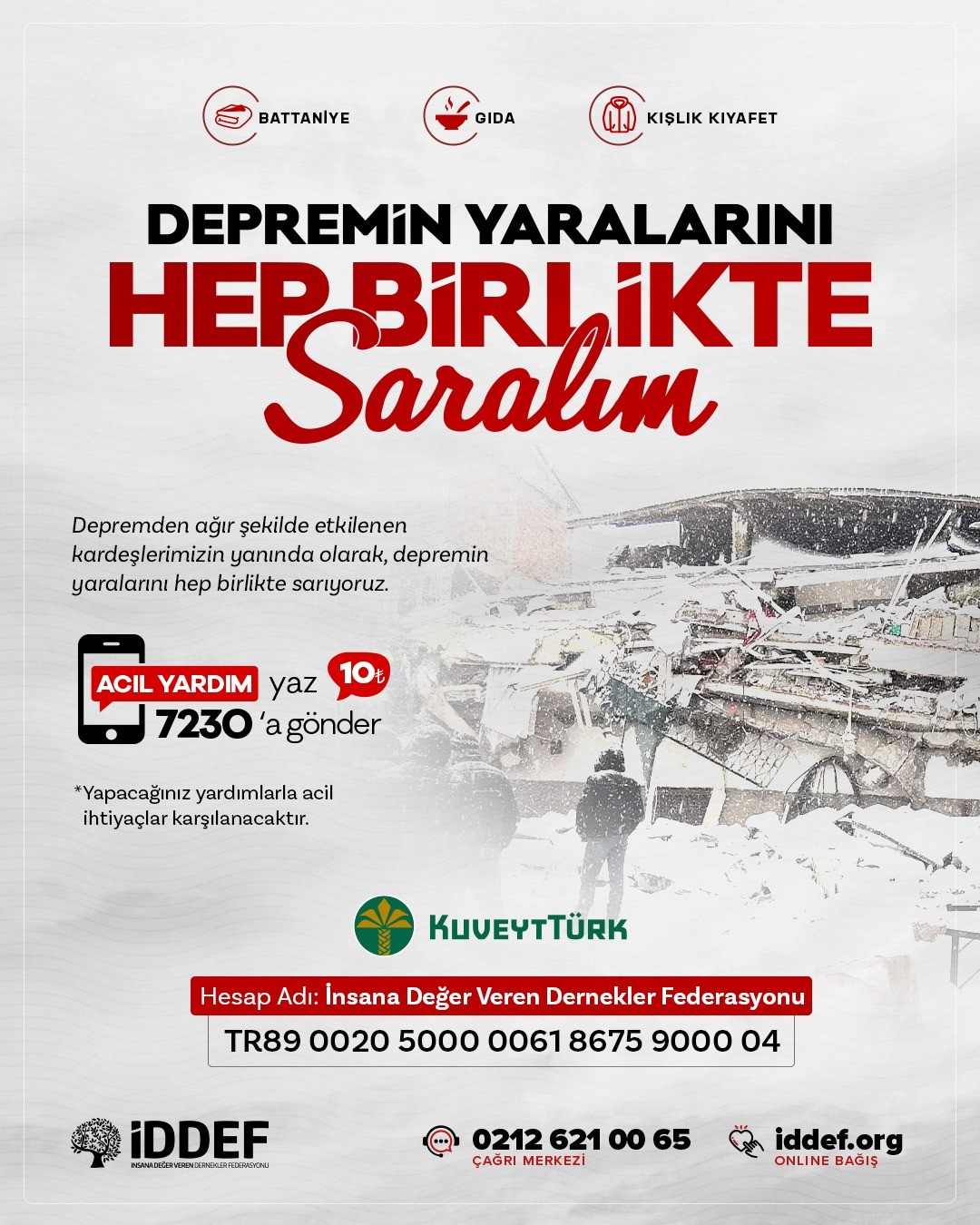İnsana Değer Veren Dernekler Federasyonu (İDDEF), merkez üssü Kahramanmaraş'ın Pazarcık ilçesi olan ve Hatay, Gaziantep, Kilis, Osmaniye, Malatya, Adıyaman, Diyarbakır, Şanlıurfa, Adana gibi illerde de yaşanan 7,7 büyüklüğündeki depremin ardından ilk olarak acil ihtiyaç kapsamında su, çorba ve meyve dağıtımına başladı. İDDEF tarafından deprem bölgelerinde acil ihtiyaç duyulan malzemeler eldiven, mont, bot, bere, çocuk mont ve kışlık giysisi, tüplü katalitik soba, tüp, yatak, battaniye, powerbank, gıda kolisi (konserve), çocuk bezi, çocuk maması ve temizlik hijyenkiti olarak sıralanırkenbölgeye sevk edilen İDDEF ekipleri arama kurtarma çalışmalarına katılıyor.