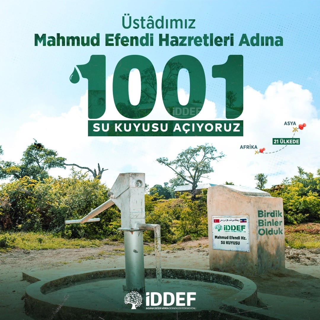 İnsana Değer Veren Dernekler Federasyonu (İDDEF), bir asra yakın ömrünü İslam’a hizmet ile geçiren, Türkiye ve dünyanın dört bir yanında binlerce talebenin yetişmesine vesile olan, son asrın müceddidi, Mahmud Efendi Hazretleri (K.s) adına 1001 su kuyusu açılması için proje başlattı. 23 Haziran 2022 tarihinde Hakk’a yürüyen Mahmud Efendi Hazretleri adına açılacak binlerce su kuyusu Ümmet diyarlarına mutluluk ve ferahlık katacak.