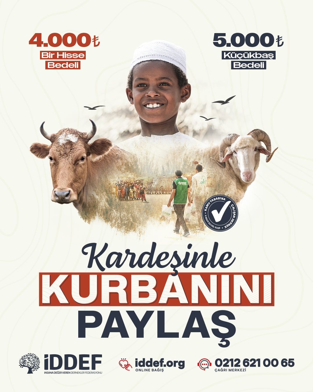 İnsana Değer Veren Dernekler Federasyonu (İDDEF) 2025 yılı vekalet yoluyla vacip kurban organizasyonunu "Kardeşinle Kurbanını Paylaş" sloganıyla Afrika, Asya, Ortadoğu ve Balkanlar'da 47 ülke 309 bölgede gerçekleştirecek.