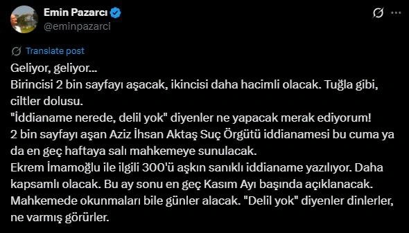 2 bin sayfayı aşan Aziz İhsan Aktaş Suç Örgütü iddianamesi bu cuma ya da en geç haftaya salı mahkemeye sunulacak. Ekrem İmamoğlu ile ilgili 300'ü aşkın sanıklı iddianame yazılıyor. Daha kapsamlı olacak. Bu ay sonu, en geç kasım ayı başında açıklanacak."