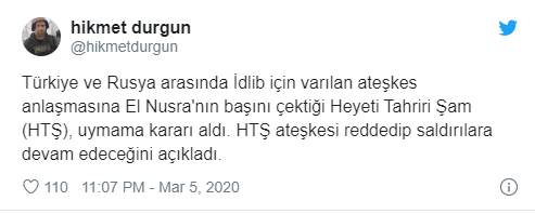 İdlib'in büyük kesiminde etkinlik gösteren Heyet Tahrir el-Şam, Türk - Rus heyetlerinin mutabık kaldığı ateşkes anlaşmasına uymayacaklarını ve saldırılara devam edeceklerini açıkladı.