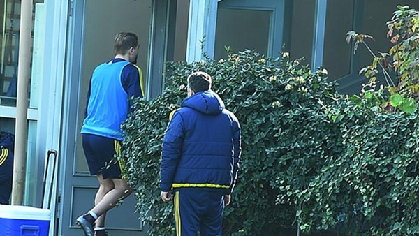 Dizini gösteren yıldız futbolcu, çalışmayı bırakıp içeri girmek istedi. Caner, hocasıyla 1-2 dakika konuştuktan sonra içeri girdi.