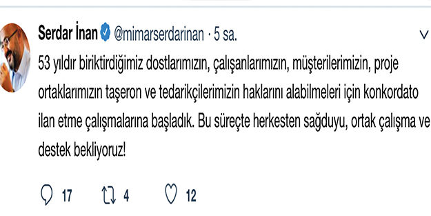 Serdar İnan da, mali durumu bozulmuş borçluları korumayı ve aynı zamanda alacaklıların da alacaklarını kısmen de olsa tahsil edebilmelerini sağlayan bir uygulama olan konkordato yoluyla borçlu ve alacaklılarıyla uzlaşmayı hedefliyor. Serdar İnan, dün sabah saatlerinde sosyal medya hesabından paylaştığı mesajında, “53 yıldır biriktirdiğimiz dostlarımızın, çalışanlarımızın, müşterilerimizin, proje ortaklarımızın taşeron ve tedarikçilerimizin haklarını alabilmeleri için konkordato ilan etme çalışmalarına başladık. Bu süreçte herkesten sağduyu, ortak çalışma ve destek bekliyoruz!” ifadelerini kullandı.