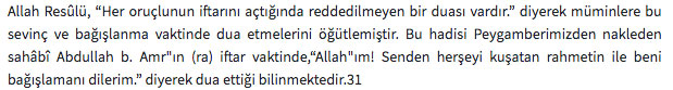 “(Ramazan ayında) Allah Tealâ’nın her gün ve gece ateşten azat ettiği kulları vardır. Her kul için kabul edilen bir dua vardır.” (Ahmed b. Hanbel, Müsned)