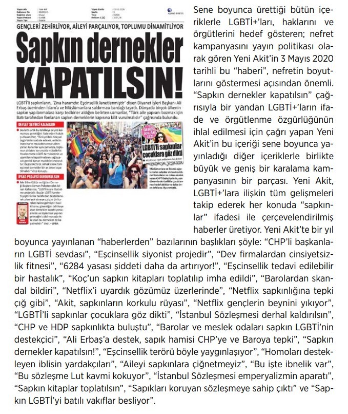 2020 yılında ulusal medyada LGBTİ sapkınlığı hakkında çıkan 1882 haberde, Akit’in 270 haberinin toplumu bilinçlendirici bir üslupta kaleme alındığı rapora yansıdı. Türk toplum ve aile yapısını koruma amacı taşıyan haberlerimizi çarpıtan KAOS GL isimli fitne yuvası, ‘nefret söylemi’ yaydığımızı ve ‘hedef gösterme’ suçu işlediğimiz iddiasında bulundu. Raporda, mezhepçi ve bölücü yayınlar yapan; Cumhuriyet, Birgün ve Evrensel gibi gazetelerin, LGBTİ’li sapkınlara sahip çıktığından ise övgüyle bahsedildi.