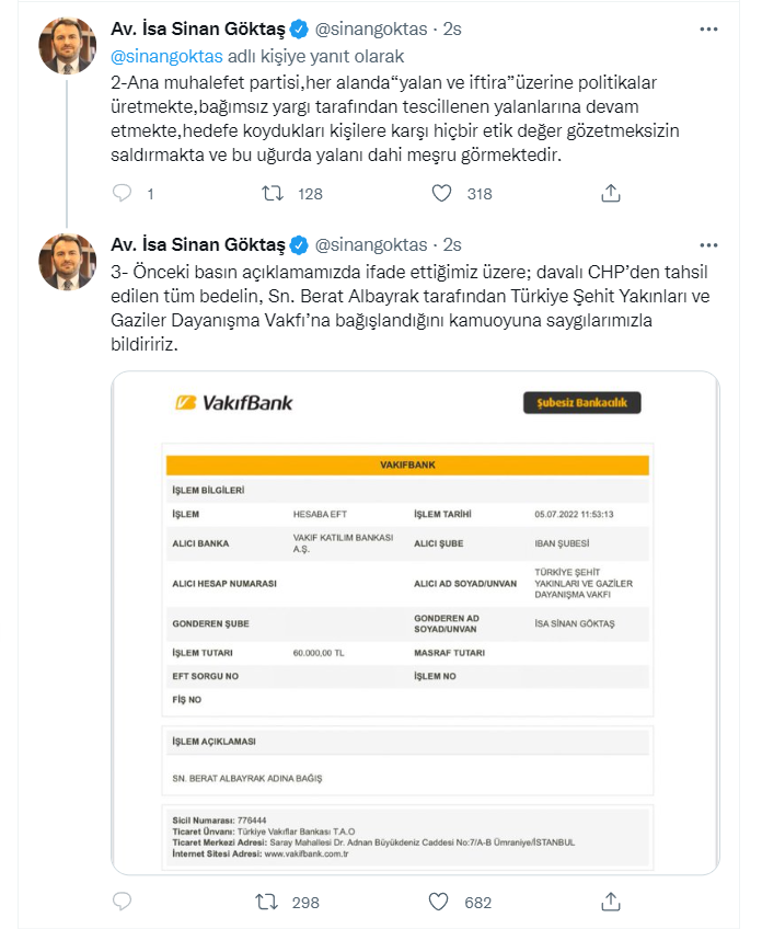Önceki basın açıklamamızda ifade ettiğimiz üzere; davalı CHP’den tahsil edilen tüm bedelin, Sn. Berat Albayrak tarafından Türkiye Şehit Yakınları ve Gaziler Dayanışma Vakfı’na bağışlandığını kamuoyuna saygılarımızla bildiririz.
