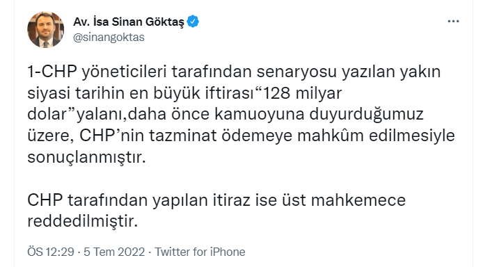CHP yöneticileri tarafından senaryosu yazılan yakın siyasi tarihin en büyük iftirası“128 milyar dolar”yalanı,daha önce kamuoyuna duyurduğumuz üzere, CHP’nin tazminat ödemeye mahkûm edilmesiyle sonuçlanmıştır.