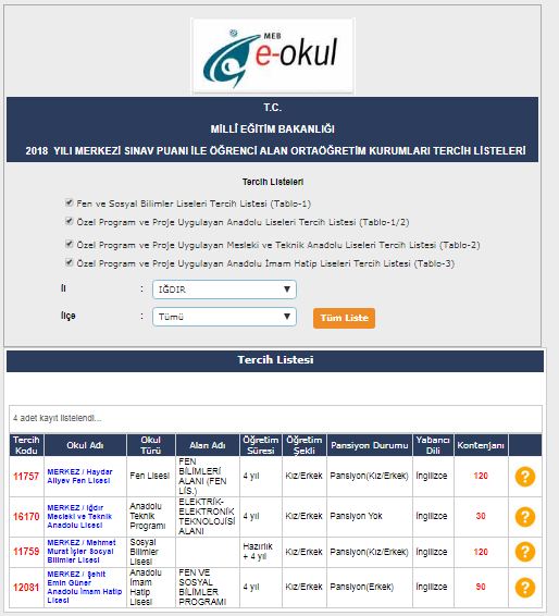 Iğdır liselerin taban puanları ve yüzdelik dilimleri. MEB'in internet sitesi eokulyd.meb.gov.tr üzerinden yapılmakta.