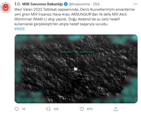 Bakanlığın Twitter hesabından yapılan açıklamada, "Mavi Vatan 2022 Tatbikatı kapsamında, Deniz Kuvvetlerimizin envanterine yeni giren Milli İnsansız Hava Aracı AKSUNGUR'dan ilk defa Milli Akıllı Mühimmat (MAM-L) atışı yapıldı. Doğu Akdeniz'de su üstü hedefi kullanılarak gerçekleştirilen atışta hedef başarıyla vuruldu." ifadeleri kullanıldı.