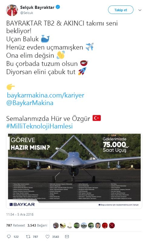 Türkiye Teknoloji Takımı Vakfı Mütevelli Heyeti Başkanı Selçuk Bayraktar, sosyal medyadan "BAYRAKTAR TB2 & AKINCI takımı seni bekliyor!" başlığıyla yeni personelalımı yapacaklarını duyurdu.