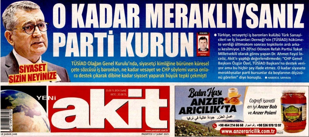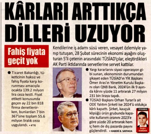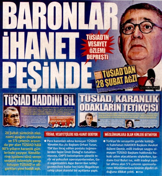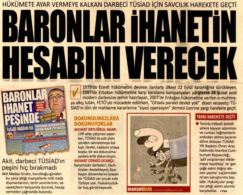 Akit, bu davanın ilk gününden itibaren "baronlar hesap verecek" diyerek peşini bırakmadı. TÜSİAD'ın her açıklamasını, her kürsü konuşmasını, her "siyasi operasyon" çığlığını manşetlerine taşıyan gazete, bugün haklılığını mahkeme kararıyla tescilletti. Yıllarca "ihanet" diye yazdıklarına hâkim de "suç" dedi.