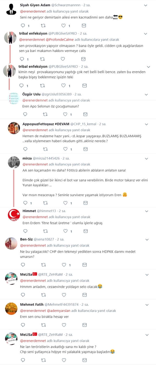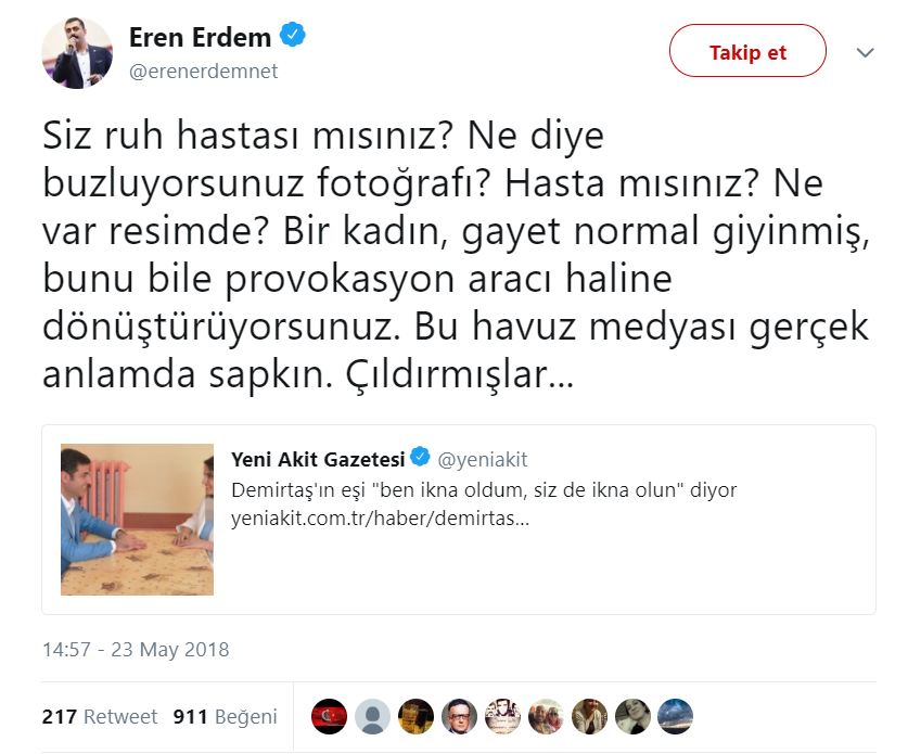 Başak Demirtaş'ın terörden yargılanan eşini ziyaretini 'ti'ye alan YeniAkit.com.tr'nin haberi HDP yandaşlarını ve Eren Erdem'i kudurttu. İhanetini unutturmak isteyen Eren Erdem provokatif paylaşımında "Siz ruh hastası mısınız?" diye hakaretler savurdu. Provokasyon yaparak Akit'e saldıran Eren Erdem "Bunu bile provokasyon aracı haline dönüştürüyorsunuz" sözleriyle şer odaklara hedef gösterdi.