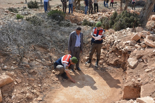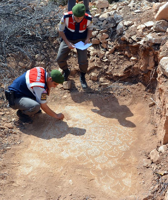 Operasyonda kaçak kazı yaptığı belirlenen Z.K., jandarma tarafından gözaltına alındı. Çevrede güvenlik önlemi alan jandarma, yaklaşık 15 dönümlük arazide yaptığı incelemede mozaik işlemeler, dibek taşı ve büyük boş bir küp buldu.