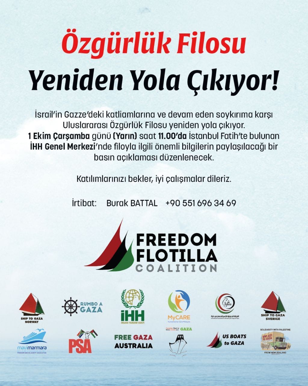İşgalci katil İsrail’in Gazze’deki katliam ve saldırılarına karşı Uluslararası Özgürlük Filosu tekrar harekete geçiyor. İHH Başkanı Bülent Yıldırım, filoyla ilgili detayları paylaşmak üzere 1 Ekim Çarşamba günü saat 11.00’de İHH Genel Merkezi’nde basın açıklaması yapacak.