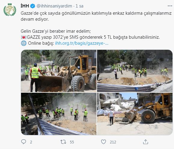Günlerce Katil İsrail’in hava saldırıları sırasında Filistinli Müslümanlara yardım götüren İnsani Yardım Vakfı İHH, şimdi de bombardımanlarda yıkılan enkazları kaldırmaya yardım ediyor. İHH’nın sosyal medya hesaplarından, “Gazze'de çok sayıda gönüllümüzün katılımıyla enkaz kaldırma çalışmalarımız devam ediyor.” ifadeleriyle yıkılan binalardaki enkazların kaldırma fotoğraflarını paylaştı.