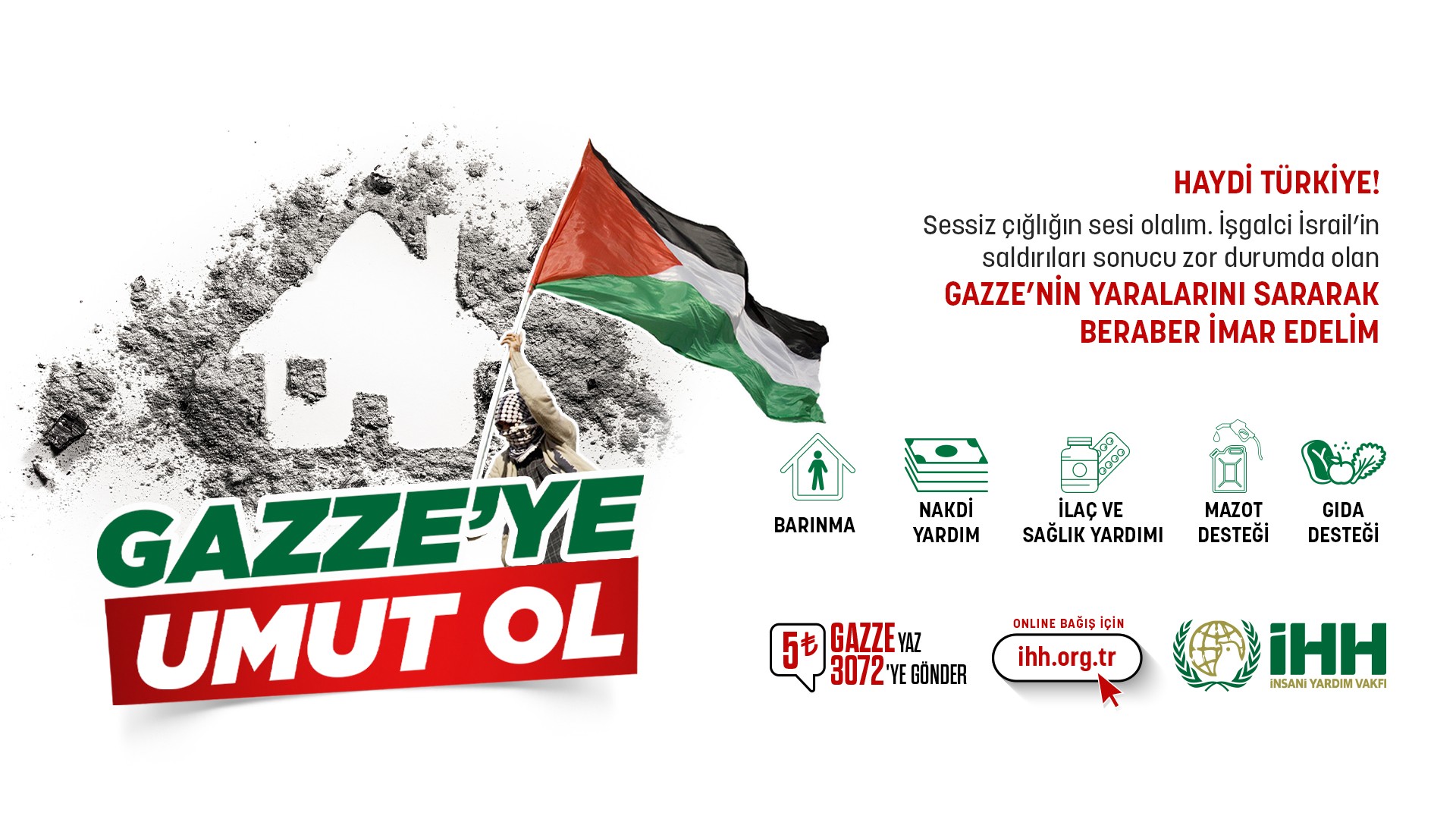 İHH İnsani Yardım Vakfı da Filistin ve Gazze’deki ihtiyaç sahipleri için “Gazze’ye Umut Ol” Acil Yardım Kampanyası başlattı. Kampanya ile birlikte hem hastane ve sağlık merkezlerindeki ilaç, tıbbi malzeme ve mazot ihtiyacı karşılanacak hem de evleri yıkılan ve ihtiyaç sahibi ailelere sıcak yemek ve gıda paketi dağıtılacak. İhtiyaç sahibi ailelere nakdi yardımda bulunulacak.