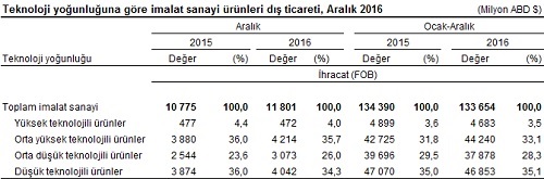 Teknoloji yoğunluğuna göre dış ticaret verileri, ISIC Rev.3 sınıflaması içinde yer alan imalat sanayi ürünlerini kapsamaktadır. Aralık ayında ISIC Rev.3'e göre imalat sanayi ürünlerinin toplam ihracattaki payı yüzde 92,1'dir. Yüksek teknoloji ürünlerinin imalat sanayi ürünleri ihracatı içindeki payı yüzde 4, orta yüksek teknolojili ürünlerin payı ise yüzde 35,7'dir.