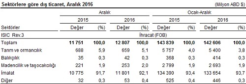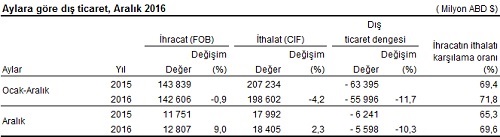 Türkiye İstatistik Kurumu ile Gümrük ve Ticaret Bakanlığı işbirliğiyle oluşturulan geçici dış ticaret verilerine göre; ihracat 2016 yılı Aralık ayında, 2015 yılının aynı ayına göre yüzde 9 artarak 12 milyar 807 milyon dolar, ithalat yüzde 2,3 artarak 18 milyar 405 milyon dolar olarak gerçekleşti.