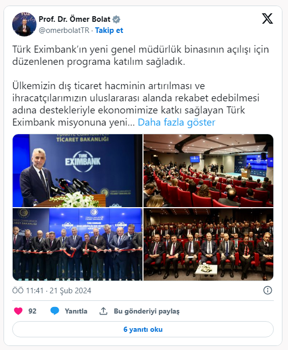Ticaret Bakanı Ömer Bolat, Eximbank yeni genel müdürlük binası açılışına katıldı.