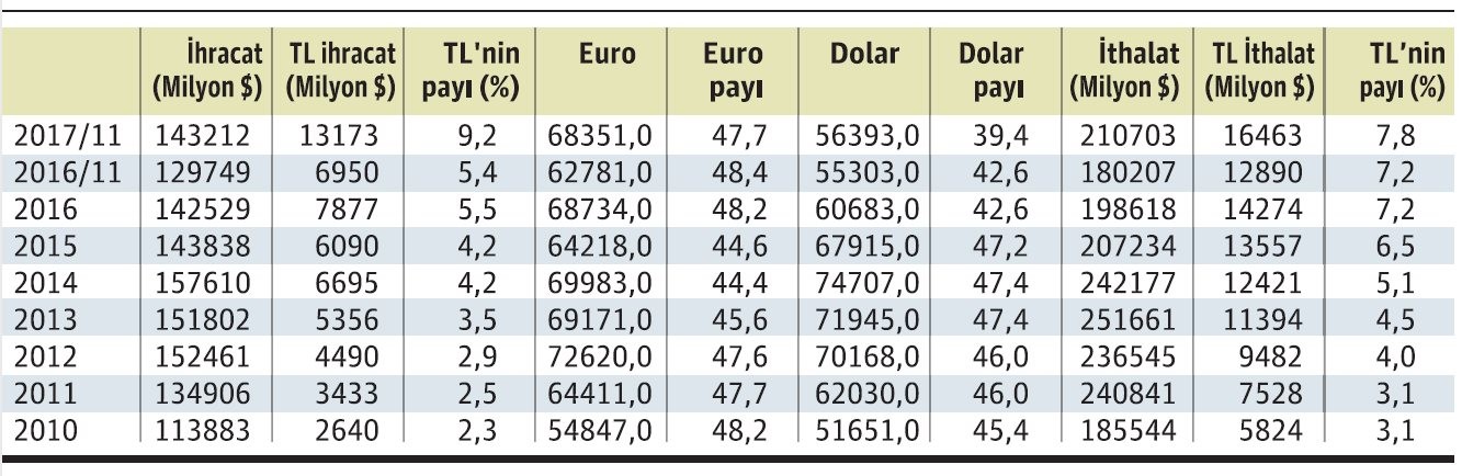 TÜİK verilerinden yapılan derlemeye göre, 2010'da 113.8 milyar dolar olan ihracatın 2 milyar 640 milyon dolarlık kısmı TL cinsinden gerçekleştirilirken, ihracat içinde TL’nin payı yüzde 2.3 olarak hesaplandı. 2011’de 134.9 milyar dolarlık ihracatın yüzde 2.54’üne karşılık gelen 3 milyar 433 milyon dolarlık kısmı TL ile yapıldı. 2012’de 152.4 milyar dolarlık ihracatın 4 milyar 490 milyon doları TL cinsinden olurken, bunun ihracat içindeki payı yüzde 2.94 oldu. 2013’te 5 milyar 356 milyon dolarlık TL cinsinden ihracatın 151.8 milyar dolarlık toplam ihracat içindeki payı yüzde 3.52’ye çıktı. 2014’te 157.6 milyar dolarlık ihracatın yüzde 4.24’ü olan 6 milyar 695 milyon dolarlık kısmı TL ile gerçekleştirilirken, 2015’te 143.8 milyar dolarlık ihracatta TL’nin payı 6 milyar 90 milyon dolar ile yüzde 4.25’e yükseldi. 2016 yılında ise 7 milyar 877 milyon dolarlık TL cinsinden ihracat, toplam 142.5 milyar dolarlık ihracat içinde yüzde 5.52 pay aldı. Geride bıraktığımız 2017’de ise 11 aylık dönemde 143.2 milyar dolarlık ihracatın yüzde 9.19’una karşılık gelen 13 milyar 173 milyon dolarlık kısmı TL cinsinden yapıldı.