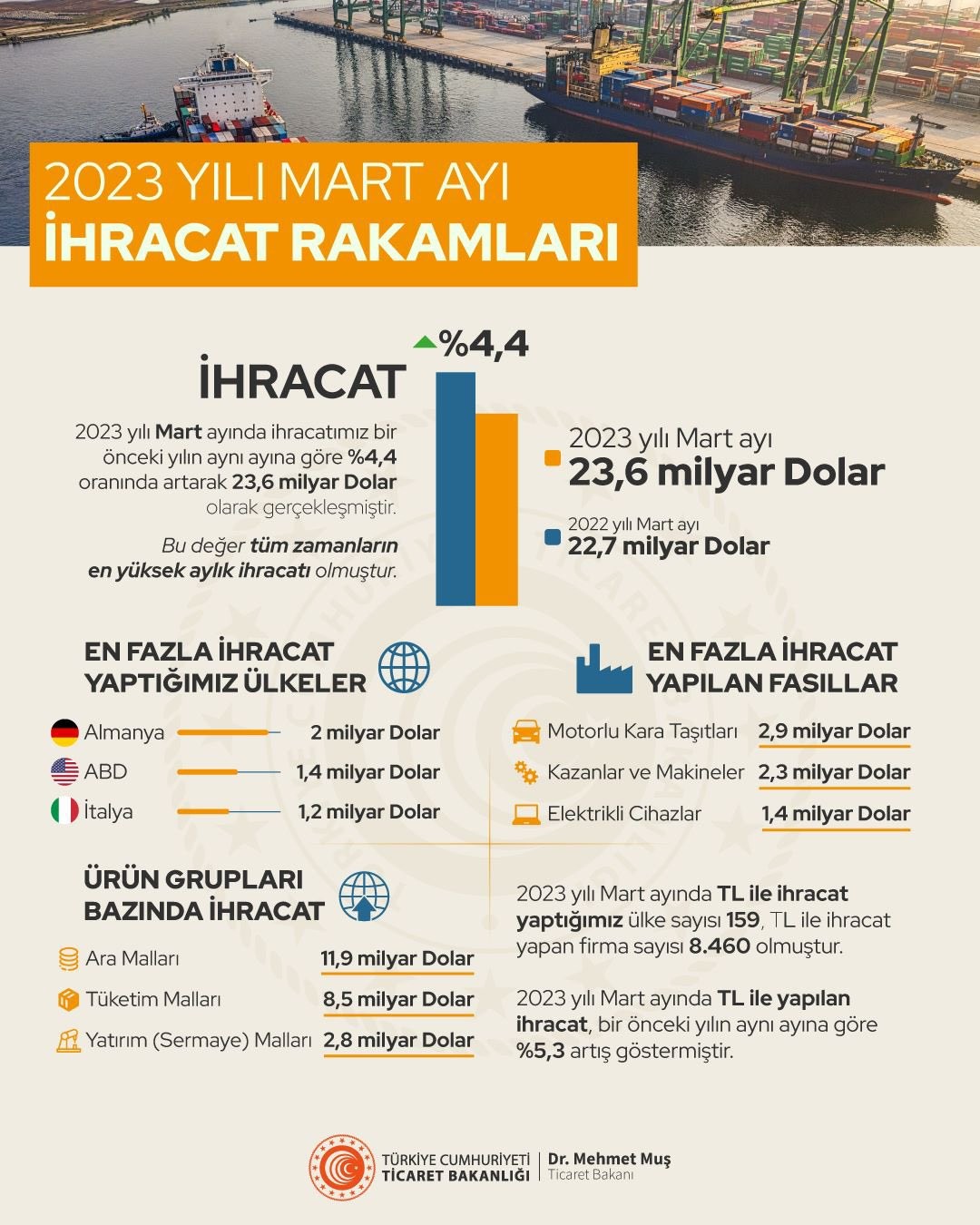 Türkiye'nin ihracatı tüm zamanların rekorunu Mart ayında yeniledi. Türkiye'nin ihracatı Mart ayında 23,6 milyar dolara çıktı. Bakan Muş "Mart ayında ihracat %4,4 artarak 23,6 milyar dolara çıktı. Böylece tüm zamanların ihracat rekoru kırılmış oldu" dedi.