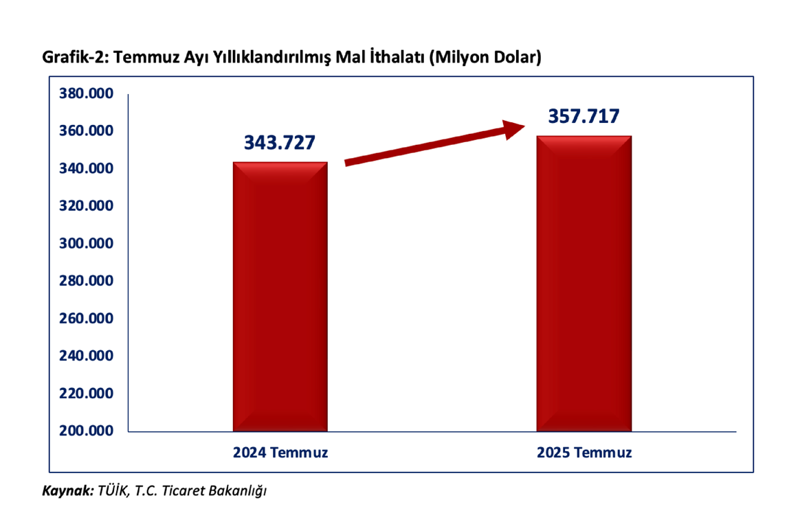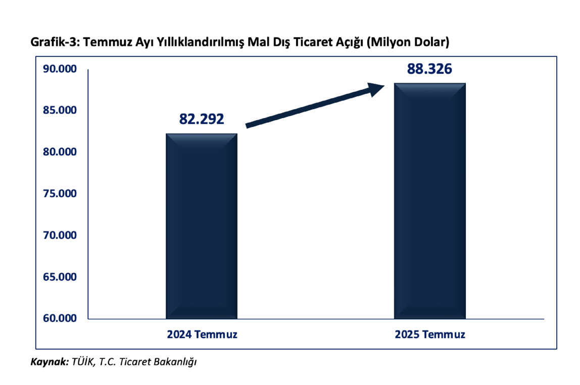 Ticaret Bakanı Ömer Bolat, temmuz ayı dış ticaret verilerine ilişkin sosyal medya hesabından açıklama yaptı. Bakan Bolat, "2025 yılı Temmuz ayında ihracatımız Cumhuriyet tarihimizin en yüksek aylık ihracat rekorunu kırarak 24,9 milyar dolar olarak gerçekleşmiştir. Yıllıklandırılmış ihracatımız da tüm zamanların en yüksek değeri olan 269,4 milyar dolara yükselmiş ve 270 milyar dolar sınırına dayanmıştır. 2025 yılının ilk 7 ayının 6'sında aylık mal ihracatımızda artış sağlanmıştır. İhracattaki büyük artış ve ithalat artış hızındaki yavaşlama neticesinde, temmuz ayında dış ticaret açığı son 9 ayın en düşük seviyesi olan 6,4 milyar dolara gerilemiştir. İhracatın ithalatı karşılama oranı ise son dokuz ayın en yüksek seviyesi olan yüzde 79,5'e yükselmiştir. Artan mal ve hizmet ihracatıyla temmuz ayında cari işlemler hesabında fazla verilmesi beklenmektedir" dedi.