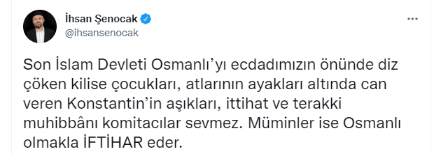 CHP'li İzmir Büyükşehir Belediye Başkanı Tunç Soyer'in ecdad Osmanlı'ya yönelik hadsiz sözlerine tepki gösteren Fıkıh Doktoru İhsan Şenocak, "Mü'minler ise Osmanlı olmakla iftihar eder." dedi.