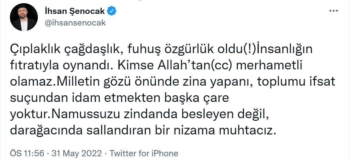Fıkıh Doktoru İhsan Şenocak, milletin gözü önünde zina yapanların toplumu ifsat suçundan idam edilmeleri gerektiğini söyledi.